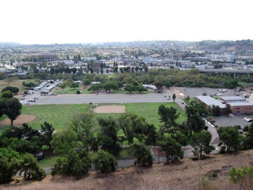 Nestled in the middle of the admiral baker recreation area in mission gorge this picnic area and rv park are surrounded by green grass and tree lined roads.
